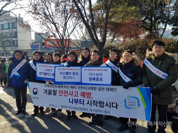 ¹ý¹«ºÎ ´ë±¸ÁعýÁö¿ø¼¾ÅÍ(¼ÒÀå ÀÌ¿ì±Ç)´Â 7ÀÏ ´ë±¸½Ã µ¿±¸ ¾ÈÀü¸ð´ÏÅͺÀ»ç´Ü µî Áö¿ª Áֹεé°ú ÇÔ²² ´ë±¸ È¿¸ñµ¿¿¡ À§Ä¡ÇÑ µ¿±¸½ÃÀå¿¡¼ °Ü¿ïö ¾ÈÀü»ç°í ¿¹¹æÀ» À§ÇÑ ¹è·Á, ¹ýÁú¼ ½Çõ¿îµ¿À» ½Ç½ÃÇÏ¿´´Ù.
