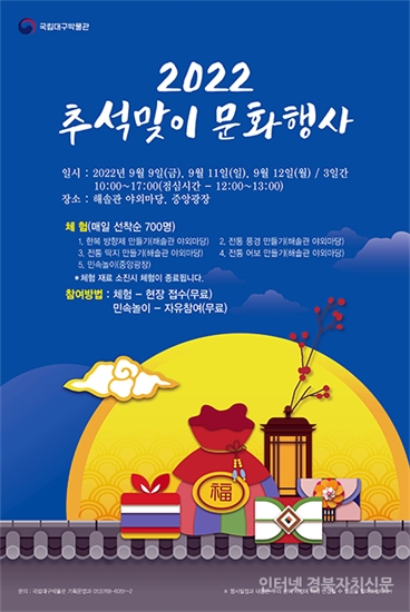 ±¹¸³´ë±¸¹Ú¹°°ü(Àå¿ëÁØ °üÀå Á÷¹«´ë¸®)Àº ¿ì¸®³ª¶ó °íÀ¯ ¸íÀýÀÎ Ãß¼®À» ¸Â¾Æ 9.9.(±Ý), 9.11.(ÀÏ), 9.12.(¿ù) 3Àϰ£ ¿Â °¡Á·ÀÌ ÇÔ²² Áñ±æ ¼ö ÀÖ´Â ÀüÅë ¹®È üÇè Çà»ç¸¦ °³ÃÖÇÑ´Ù.