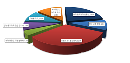 ¶ÇÇÑ, 2025³âµµ ¿ì¸® °æÁ¦¸¦ À§ÇùÇÏ´Â ´ë¿Ü ¸®½ºÅ© ¿äÀÎÀ» ¹¯´Â Áú¹®¿¡´Â ¡®Æ®·³ÇÁ 2±â Åë»óÁ¤Ã¥¡¯(32.8%), ¡®À¯°¡, ¿øÀÚÀç°¡ º¯µ¿¼º¡¯(23.3%), ¡®ùÛ¼öÃâ »ê¾÷°æÀï·Â ¾àÈ¡¯(12.9%), ¡®°íȯÀ² ±âÁ¶¡¯(10.3%), ¡®Áß±¹ ³»¼ö ħü¡¯ (9.5%), ¡®ÀüÀï µî ÁöÁ¤ÇÐ ±äÀå Àå±âÈ¡¯(6.9%), ¡®¼¼°è°ø±Þ¸Á ÀçÆí¡¤ºí·ÏÈ¡¯(4.3%) ¼øÀ¸·Î ³ªÅ¸³µ´Ù.