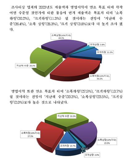 Á¶»ç´ë»ó ¾÷üÀÇ 2023³âµµ ¸ÅÃâ¾×°ú ¿µ¾÷ÀÌÀÍÀÌ ¿¬ÃÊ ¸ñÇ¥ ´ëºñ °¢°¢ ¾î¶² ¼öÁØÀÏ °ÍÀΰ¡¿¡ ´ëÇÑ ¹°À½¿¡ ¸ÕÀú ¸ÅÃâ¾×Àº ¸ñǥġ ´ëºñ ¡®¼ÒÆøÇÏÇ⡯(30.2%), ¡®Å©°ÔÇÏÇ⡯(11.3%) µÉ °ÍÀ̶ó´Â Àü¸ÁÀÌ ¡®Áö³ÇØ ¼öÁØ¡¯(26.4%), ¡®¼ÒÆø »óÇ⡯(28.3%), ¡®Å©°Ô »óÇ⡯(3.8%)º¸´Ù ´õ ³ô°Ô Á¶»ç µÆ´Ù.