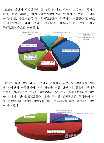 2023³â »ó¹Ý±â »ç¾÷½ÇÀû¿¡ Å« ¿µÇâÀ» ¹ÌÄ¥ ¸®½ºÅ© ¿äÀÎÀ¸·Î ¡®¿øÀÚÀç°¡°Ý »ó½Â¡¯(34.0%), ¡®¹°°¡¡¤±Ý¸®Àλó¡¯(24.0%), ¡®°í¹°°¡·Î ÀÎÇÑ ¼ÒºñµÐÈ¡¯(14.0%), ¡®ÁÖ¿ä¼öÃâ±¹ °æ±âħü¡¯(12.0%), ¡®¿øºÎÀÚÀç ¼ö±ÞºÒ¾È¡¯(11.0%), ¡®±â¾÷ºÎ´ã¹ý¾È ÀÔ¹ý¡¯(3.0%), ¡®ÁöÁ¤ÇÐÀû ¸®½ºÅ©(¹Ì,Áß °¥µî, ÀüÀï µî)¡¯(2.0%) ¼øÀ¸·Î ´äº¯Çß´Ù.
