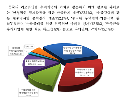 Áß±¹ÀÇ ¸®¿ÀÇÁ´×À» ¿ì¸®±â¾÷ÀÇ ±âȸ·Î Ȱ¿ëÇϱâ À§ÇØ ÇÊ¿äÇÑ °úÁ¦·Î´Â ¡®¾ÈÁ¤ÀûÀÎ °æÁ¦È°µ¿À» À§ÇÑ ÇÑÁß°ü°è °³¼±¡¯(32.1%), ¡®¹Ì¡¤Áß°¥µî°ú °°Àº ´ëÁß±¹»ç¾÷ ºÒÈ®½Ç¼º ÇØ¼Ò¡¯(32.1%), ¡®Áß±¹³» ¹«¿ªÀ庮¡¤±â¼ú±ÔÁ¦ ¿ÏÈ¡¯(16.1%), ¡®¼öÃâÁõ´ë¸¦ À§ÇÑ Àû±ØÀûÀÎ ¸¶ÄÉÆÃ Àü°³¡¯(12.5%), ¡®Áß±¹ÁøÃ⠿츮±â¾÷¿¡ ´ëÇÑ ¾Ö·Î ÇØ¼Ò¡¯(1.8%) ¼øÀ¸·Î ³ªÅ¸³µ´Ù. <¡®±âŸ¡¯(5.4%)>