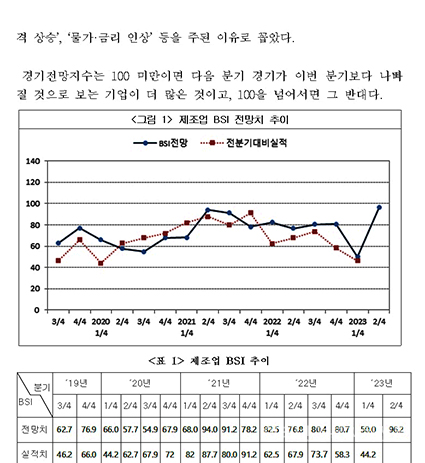2023³â 2/4ºÐ±â BSIÁö¼ö°¡ Å« ÆøÀ¸·Î »ó½ÂÇßÀ¸³ª, ¿©ÀüÈ÷ ¿ì¸® ±â¾÷µéÀÌ ¿¹»óÇÏ´Â °æ±âÀü¸ÁÀº Áö³ ºÐ±âº¸´Ù ¡®È£Àü¡¯µÉ °ÍÀ̶ó°í ´äÇÑ ±â¾÷º¸´Ù ¡®¾ÇÈ¡¯µÉ °ÍÀ̶ó°í ´äÇÑ ±â¾÷ÀÌ ´õ ¸¹¾ÒÀ¸¸ç, ±× ¿øÀÎÀ» ¡®¿øÀÚÀç °¡°Ý »ó½Â¡¯, ¡®¹°°¡¡¤±Ý¸® ÀÎ»ó¡¯ µîÀ» ÁÖµÈ ÀÌÀ¯·Î ²Å¾Ò´Ù.