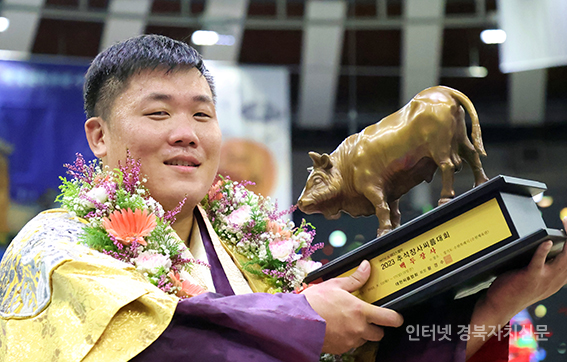1¼ö¿øÆ¯·Ê½Ã ¼ö¿øÃ¼À°°ü¿¡¼ ¿¸° ¡®À§´õ½ºÁ¦¾à 2023 Ãß¼®Àå»ç¾¾¸§´ëȸ¡¯ ¹éµÎÀå»ç(140kgÀÌÇÏ)¿¡ µî±ØÇÑ ±è Áø(ÁõÆò±ºÃ»)ÀÌ Àå»ç²É°¡¸¶¸¦ Ÿ°í Àå»çÀÎÁõ¼¿Í Ȳ¼ÒÆ®·ÎÇǸ¦ µé°í ±â³ä»çÁøÀ» Âï°í ÀÖ´Ù.