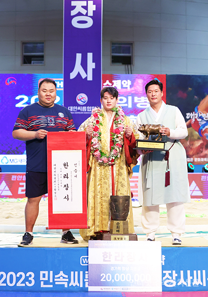 2ÃæÃ»ºÏµµ Á¦Ãµ½Ã Á¦ÃµÃ¼À°°ü¿¡¼ ¿¸° ¡®À§´õ½ºÁ¦¾à 2023 ¹Î¼Ó¾¾¸§ Á¦ÃµÀǺ´Àå»ç¾¾¸§´ëȸ¡¯ ÇѶóÀå»ç(105kgÀÌÇÏ)¿¡ µî±ØÇÑ Â÷¹Î¼ö(¿µ¾Ï±º¹Î¼Ó¾¾¸§´Ü)°¡ ±è±âÅ °¨µ¶(¿ÞÂÊ) À±Á¤¼ö ÄÚÄ¡(¿À¸¥ÂÊ)¿Í ±â³ä»çÁøÀ» Âï°í ÀÖ´Ù.