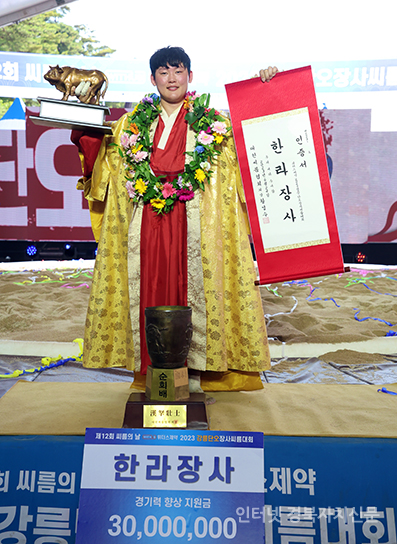 1 °¸ª´Ü¿ÀÀå»ç¾¾¸§´ëȸ¡¯ ÇѶóÀå»ç(105kgÀÌÇÏ)¿¡ µî±ØÇÑ ¿Àâ·Ï(MG»õ¸¶À»±Ý°í¾¾¸§´Ü)ÀÌ Àå»çÀÎÁõ¼¿Í Ȳ¼ÒÆ®·ÎÇǸ¦ µé°í ±â³ä»çÁøÀ» Âï°í ÀÖ´Ù.