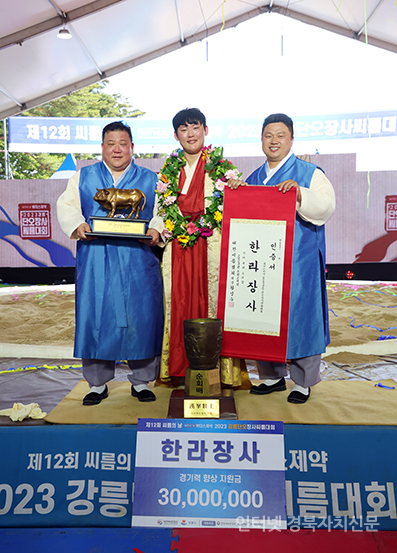 2°¸ª´Ü¿ÀÀå»ç¾¾¸§´ëȸ¡¯ ÇѶóÀå»ç(105kgÀÌÇÏ)¿¡ µî±ØÇÑ ¿Àâ·Ï(MG»õ¸¶À»±Ý°í¾¾¸§´Ü)ÀÌ ÀåÀ±È£ °¨µ¶(¿ÞÂÊ) ±èÁ¾Áø ÄÚÄ¡(¿À¸¥ÂÊ)¿Í ±â³ä»çÁøÀ» Âï°í ÀÖ´Ù