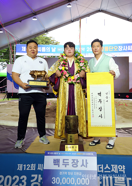 2°¸ª´Ü¿ÀÀå»ç¾¾¸§´ëȸ¡¯ ¹éµÎÀå»ç(140kgÀÌÇÏ)¿¡ µî±ØÇÑ ±è¹ÎÀç(¿µ¾Ï±º¹Î¼Ó¾¾¸§´Ü)°¡ ±è±âÅ °¨µ¶(¿À¸¥ÂÊ), À±Á¤¼ö ÄÚÄ¡(¿ÞÂÊ)¿Í ±â³ä»çÁøÀ» Âï°í ÀÖ´Ù.