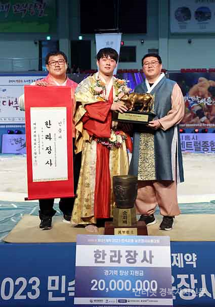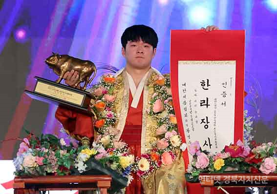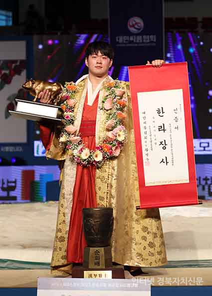 32023 ¹Î¼Ó¾¾¸§ º¸ÀºÀå»ç¾¾¸§´ëȸ¡¯ ÇѶóÀå»ç(105kgÀÌÇÏ)¿¡ µî±ØÇÑ ¹Ú¹Î±³(¿ëÀÎÆ¯·Ê½Ãû)°¡ Àå´öÁ¦ °¨µ¶(¿À¸¥ÂÊ) ¿ìÇü¿øÄÚÄ¡(¿ÞÂÊ)¿Í ±â³ä»çÁøÀ» Âï°í ÀÖ´Ù.