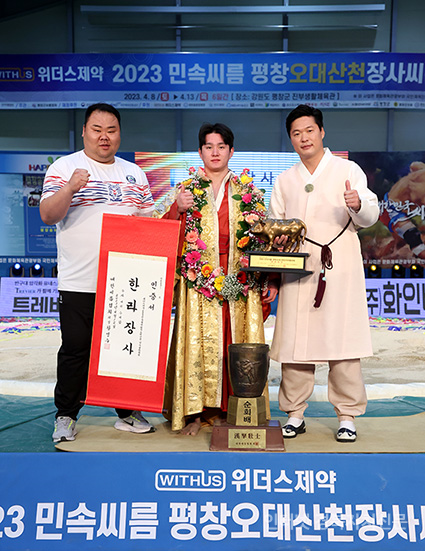 3Æòⱺ ÁøºÎ»ýȰüÀ°°ü¿¡¼ ¿¸° ¡®À§´õ½ºÁ¦¾à 2023 ¹Î¼Ó¾¾¸§ Æòâ¿À´ë»êõÀå»ç¾¾¸§´ëȸ¡¯ ÇѶóÀå»ç(105kgÀÌÇÏ)¿¡ µî±ØÇÑ Â÷¹Î¼ö(¿µ¾Ï±º¹Î¼Ó¾¾¸§´Ü)°¡ ±è±âÅ °¨µ¶(¿À¸¥ÂÊ) À±Á¤¼ö ÄÚÄ¡(¿ÞÂÊ)¿Í ±â³ä»çÁøÀ» Âï°í ÀÖ´Ù.