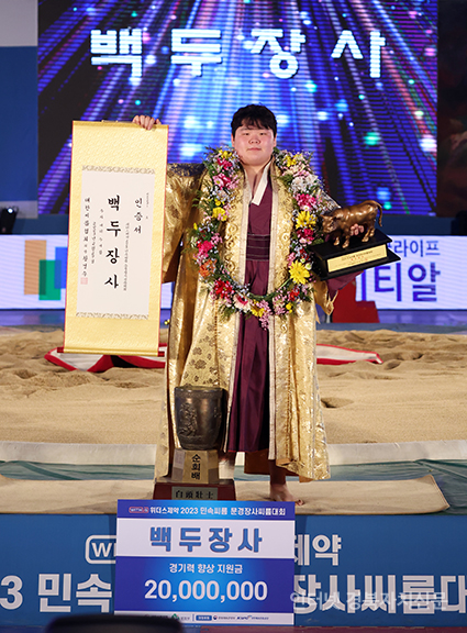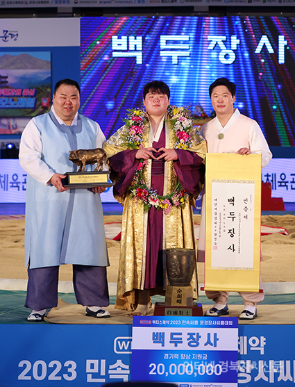 2023 ¹Î¼Ó¾¾¸§ ¹®°æÀå»ç¾¾¸§´ëȸ¡¯ ¹éµÎÀå»ç(140kgÀÌÇÏ)¿¡ µî±ØÇÑ ±è¹ÎÀç(¿µ¾Ï±º¹Î¼Ó¾¾¸§´Ü)°¡ Àå»çÀÎÁõ¼¿Í Ȳ¼ÒÆ®·ÎÇǸ¦ µé°í ±â³ä»çÁøÀ» Âï°í ÀÖ´Ù.