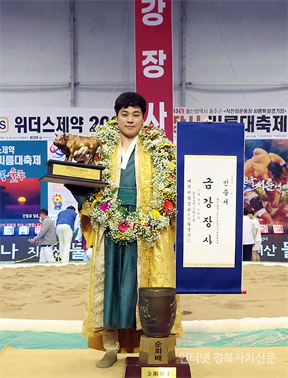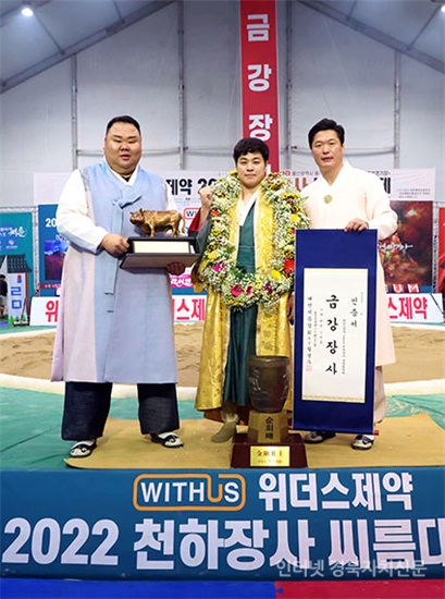 õÇÏÀå»ç¾¾¸§´ëÃàÁ¦¡¯ ±Ý°Àå»ç(90kgÀÌÇÏ)¿¡ µî±ØÇÑ ÃÖÁ¤¸¸(¿µ¾Ï±º¹Î¼Ó¾¾¸§´Ü)ÀÌ Àå»çÀÎÁõ¼¿Í Ȳ¼ÒÆ®·ÎÇǸ¦ µé°í ±â³ä»çÁøÀ» Âï°í ÀÖ´Ù.2