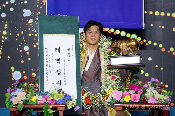 1õÇÏÀå»ç¾¾¸§´ëÃàÁ¦¡¯ ŹéÀå»ç(80kgÀÌÇÏ)¿¡ µî±ØÇÑ ³ë¹ü¼ö(¿ïÁÖ±ºÃ»)°¡ Àå»ç²É°¡¸¶¸¦ Ÿ°í Àå»çÀÎÁõ¼¿Í Ȳ¼ÒÆ®·ÎÇǸ¦ µé°í ±â³ä»çÁøÀ» Âï°í ÀÖ´Ù.