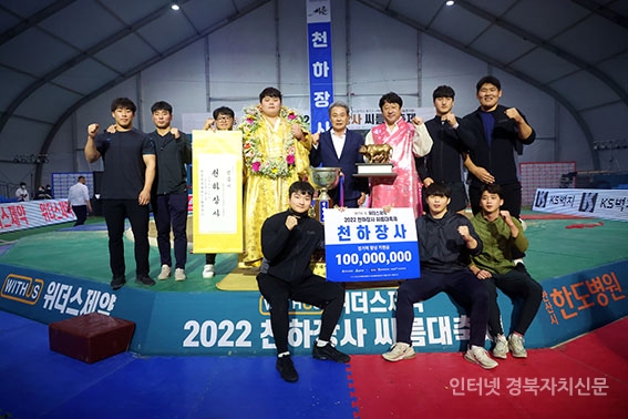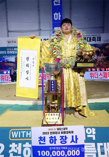 1õÇÏÀå»ç¾¾¸§´ëÃàÁ¦¡¯ õÇÏÀå»ç(140kgÀÌÇÏ)¿¡ µî±ØÇÑ ±è¹ÎÀç(¿ï»ê´ëÇб³)°¡ Àå»ç²É°¡¸¶¸¦ Ÿ°í Àå»çÀÎÁõ¼¿Í Ȳ¼ÒÆ®·ÎÇǸ¦ µé°í ±â³ä»çÁøÀ» Âï°í ÀÖ´Ù.