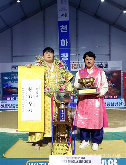 2õÇÏÀå»ç¾¾¸§´ëÃàÁ¦¡¯ õÇÏÀå»ç(140kgÀÌÇÏ)¿¡ µî±ØÇÑ ±è¹ÎÀç(¿ï»ê´ëÇб³)°¡ Àå»çÀÎÁõ¼¿Í Ȳ¼ÒÆ®·ÎÇǸ¦ µé°í ±â³ä»çÁøÀ» Âï°í ÀÖ´Ù.
