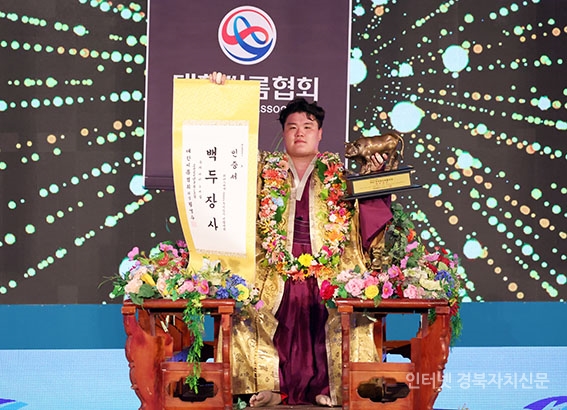 2°í¼º±º °í¼º±¹¹ÎüÀ°¼¾ÅÍ¿¡¼ ¿¸° ¡®À§´õ½ºÁ¦¾à 2022 Ãß¼®Àå»ç¾¾¸§´ëȸ¡¯ ¹éµÎÀå»ç(140kgÀÌÇÏ)¿¡ µî±ØÇÑ À强¿ì(¿µ¾Ï±º¹Î¼Ó¾¾¸§´Ü)°¡ Àå»çÀÎÁõ¼¿Í Ȳ¼ÒÆ®·ÎÇǸ¦ µé°í ±â³ä»çÁøÀ» Âï°í ÀÖ´Ù.