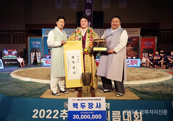 3°í¼º±º °í¼º±¹¹ÎüÀ°¼¾ÅÍ¿¡¼ ¿¸° ¡®À§´õ½ºÁ¦¾à 2022 Ãß¼®Àå»ç¾¾¸§´ëȸ¡¯ ¹éµÎÀå»ç(140kgÀÌÇÏ)¿¡ µî±ØÇÑ À强¿ì(¿µ¾Ï±º¹Î¼Ó¾¾¸§´Ü)°¡ ±è±âÅ °¨µ¶(¿ÞÂÊ), À±Á¤¼ö ÄÚÄ¡(¿À¸¥ÂÊ)¿Í ±â³ä»çÁøÀ» Âï°í ÀÖ´Ù.