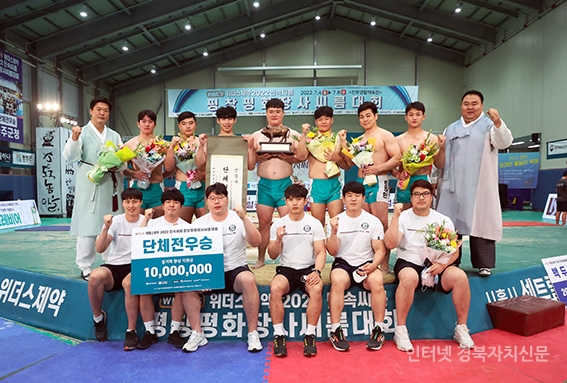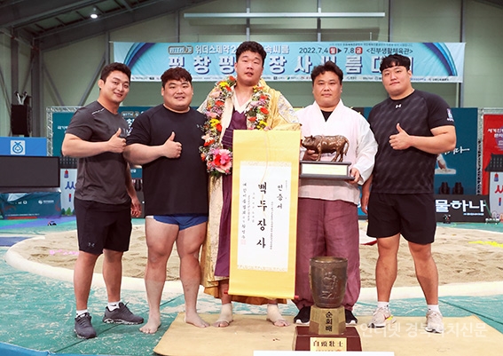 4Æòⱺ ÁøºÎ»ýȰüÀ°°ü¿¡¼ ¿¸° ¡®À§´õ½ºÁ¦¾à 2022 ¹Î¼Ó¾¾¸§ ÆòâÆòÈÀå»ç¾¾¸§´ëȸ¡¯ ¹éµÎÀå»ç(140kgÀÌÇÏ)¿¡ µî±ØÇÑ Á¤Ã¢Á¶(¼ö¿øÆ¯·Ê½Ãû)°¡ ÀÌÃæ¿± °¨µ¶(¿À¸¥ÂÊ µÎ¹øÂ°) ±×¸®°í ÆÀ µ¿·áµé°ú ±â³ä»çÁøÀ» Âï°í ÀÖ´Ù.