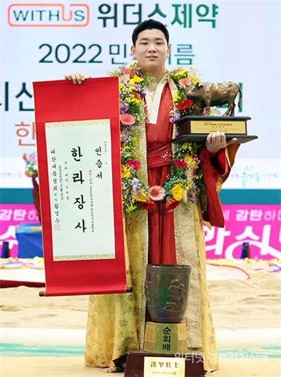 1±«»ê±º ±«»ê¹®È­Ã¼À°°ü¿¡¼­ ¿­¸° ¡®À§´õ½ºÁ¦¾à 2022 ¹Î¼Ó¾¾¸§ ±«»êÀå»ç¾¾¸§´ëȸ¡¯ ÇѶóÀå»ç(105kgÀÌÇÏ)¿¡ µî±ØÇÑ ±è¹«È£(¿ïÁÖ±ºÃ»)°¡ Àå»çÀÎÁõ¼­¿Í Ȳ¼ÒÆ®·ÎÇǸ¦ µé°í ±â³ä»çÁøÀ» Âï°í ÀÖ´Ù.