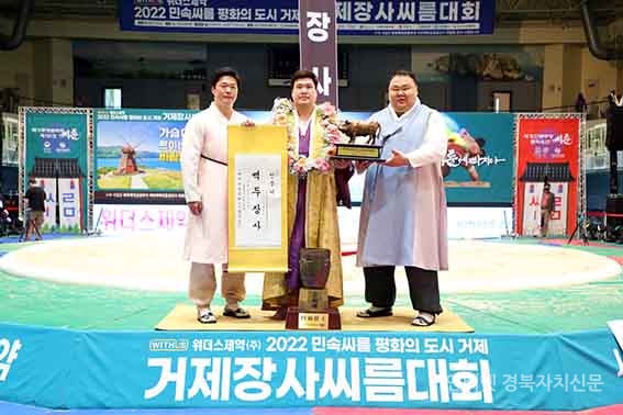 3°ÅÁ¦Àå»ç¾¾¸§´ëȸ¡¯ ¹éµÎÀå»ç(140kgÀÌÇÏ)¿¡ µî±ØÇÑ À±¼º¹Î(¿µ¾Ï±º¹Î¼Ó¾¾¸§´Ü)ÀÌ ±è±âÅ °¨µ¶(¿ÞÂÊ)°ú À±Á¤¼ö ÄÚÄ¡(¿À¸¥ÂÊ)¿Í ±â³ä»çÁøÀ» Âï°í ÀÖ´Ù.