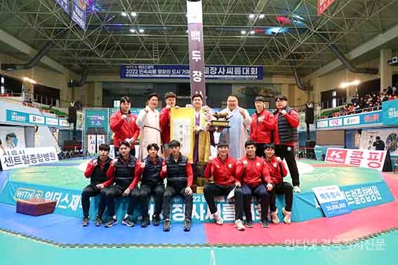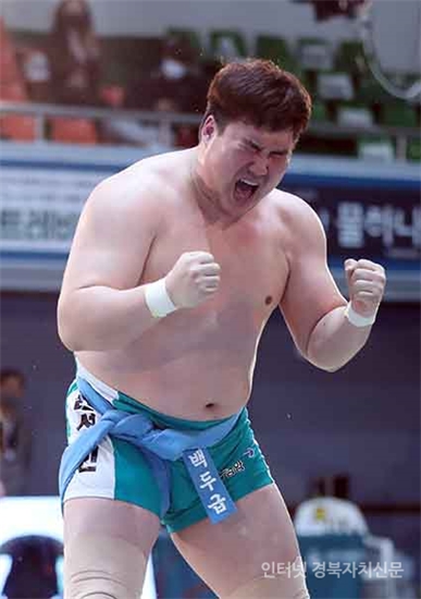 2°ÅÁ¦Àå»ç¾¾¸§´ëȸ¡¯ ¹éµÎÀå»ç(140kgÀÌÇÏ)¿¡ µî±ØÇÑ À±¼º¹Î(¿µ¾Ï±º¹Î¼Ó¾¾¸§´Ü)ÀÌ Àå»ç ²É°¡¸¶¸¦ Ÿ°í ±â³ä»çÁøÀ» Âï°í ÀÖ´Ù.