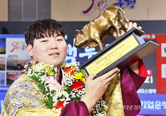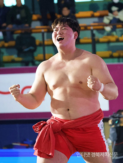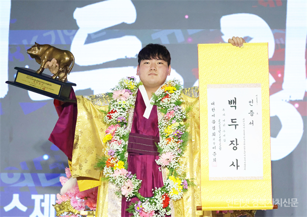 ¹Î¼Ó¾¾¸§ ¹®°æ¿À¹ÌÀÚÀå»ç¾¾¸§´ëȸ¡¯ ¹éµÎÀå»ç(140kgÀÌÇÏ)¿¡ µî±ØÇÑ ÃÖ¼º¹Î(žȱºÃ»)ÀÌ ¿ì½Â ÈÄ ±â»ÝÀ» Ç¥Çϰí ÀÖ´Ù.