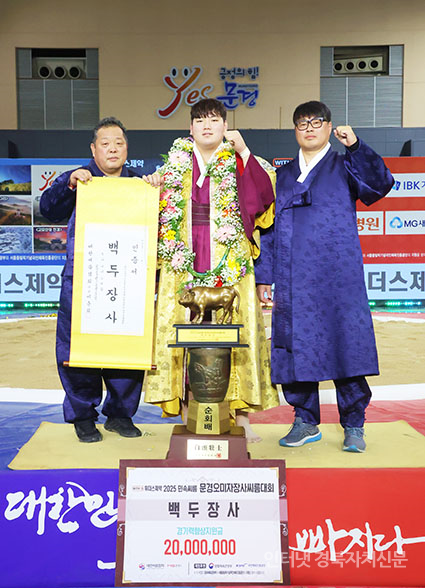 ¹Î¼Ó¾¾¸§ ¹®°æ¿À¹ÌÀÚÀå»ç¾¾¸§´ëȸ¡¯ ¹éµÎÀå»ç(140kgÀÌÇÏ)¿¡ µî±ØÇÑ ÃÖ¼º¹Î(žȱºÃ»)ÀÌ Àå»ç²É°¡¸¶¸¦ Ÿ°í Àå»çÀÎÁõ¼¿Í Ȳ¼ÒÆ®·ÎÇǸ¦ µé°í ±â³ä»çÁøÀ» Âï°í ÀÖ´Ù.