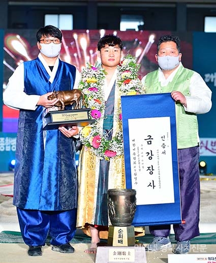 2 ¹®°æ½Ç³»Ã¼À°°ü¿¡¼ ¿¸° ¡®À§´õ½ºÁ¦¾à 2021 ¹Î¼Ó¾¾¸§ ¹®°æ¿ÕÁß¿ÕÀü¡¯ ±Ý°Àå»ç(90kgÀÌÇÏ)¿¡ µî±ØÇÑ ±è±â¼ö(žȱºÃ»)°¡ Ȳ¼ÒÆ®·ÎÇÇ¿Í Àå»çÀÎÁõ¼¸¦ µé°í ±â³ä»çÁøÀ» Âï°í ÀÖ´Ù.