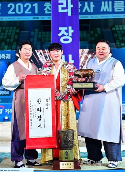 2021 õÇÏÀå»ç ¾¾¸§´ëÃàÁ¦¡¯ ÇѶóÀå»ç(105kgÀÌÇÏ)¿¡ µî±ØÇÑ ¿Àâ·Ï(¿µ¾Ï±º¹Î¼Ó¾¾¸§´Ü)ÀÌ Àå»çÀÎÁõ¼¿Í Ȳ¼ÒÆ®·ÎÇǸ¦ µé°í ±â³ä»çÁøÀ» Âï°í ÀÖ´Ù.1
