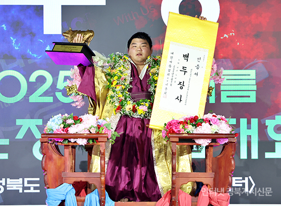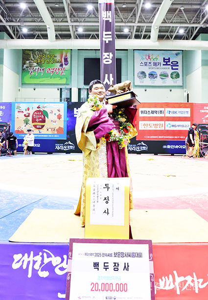 2025 ¹Î¼Ó¾¾¸§º¸ÀºÀå»ç¾¾¸§´ëȸ¡¯ ¹éµÎÀå»ç(140kgÀÌÇÏ)¿¡ µî±ØÇÑ ±èµ¿Çö(¿ëÀÎÆ¯·Ê½Ãû)ÀÌ Àå»ç²É°¡¸¶¸¦ Ÿ°í Àå»çÀÎÁõ¼­¿Í Ȳ¼ÒÆ®·ÎÇǸ¦ µé°í ±â³ä»çÁøÀ» Âï°í ÀÖ´Ù.