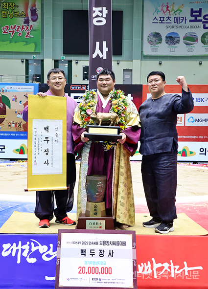 2025 ¹Î¼Ó¾¾¸§º¸ÀºÀå»ç¾¾¸§´ëȸ¡¯ ¹éµÎÀå»ç(140kgÀÌÇÏ)¿¡ µî±ØÇÑ ±èµ¿Çö(¿ëÀÎÆ¯·Ê½Ãû)ÀÌ Àå´öÁ¦ °¨µ¶(¿À¸¥ÂÊ), ¿ìÇü¿ø ÄÚÄ¡(¿ÞÂÊ)¿Í ±â³ä»çÁøÀ» Âï°í ÀÖ´Ù
