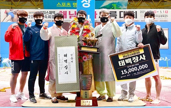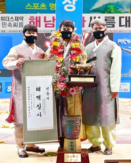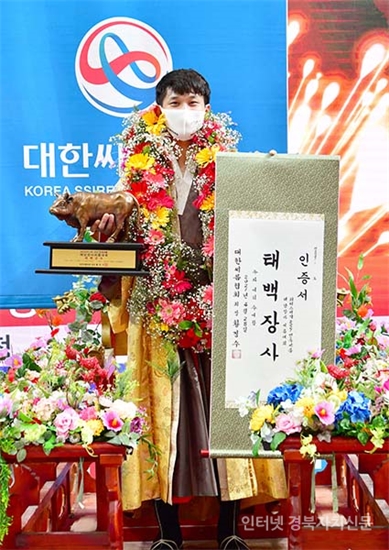 2021 ÇØ³²Àå»ç¾¾¸§´ëȸ¡¯ ŹéÀå»ç(80kgÀÌÇÏ)¿¡ µî±ØÇÑ ³ë¹ü¼ö(¿ïÁÖ±ºÃ»)°¡ Àå»çÀÎÁõ¼¿Í Ȳ¼ÒÆ®·ÎÇǸ¦ µé°í ±â³ä»çÁøÀ» Âï°í ÀÖ´Ù.