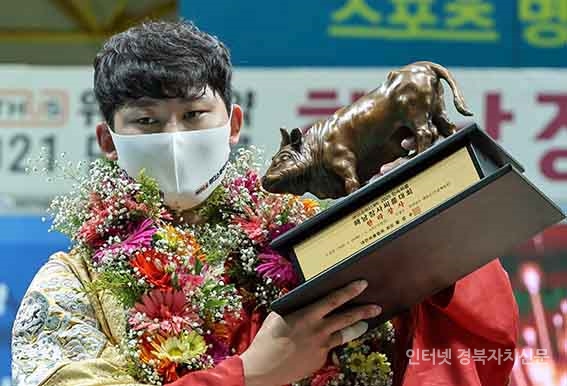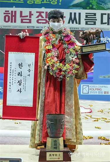 2ÇØ³²Àå»ç¾¾¸§´ëȸ¡¯ ÇѶóÀå»ç(105kgÀÌÇÏ)¿¡ µî±ØÇÑ ¿Àâ·Ï(¿µ¾Ï±º¹Î¼Ó¾¾¸§´Ü)ÀÌ È²¼ÒÆ®·ÎÇǸ¦ µé°í ±â³ä»çÁøÀ» Âï°í ÀÖ´Ù.