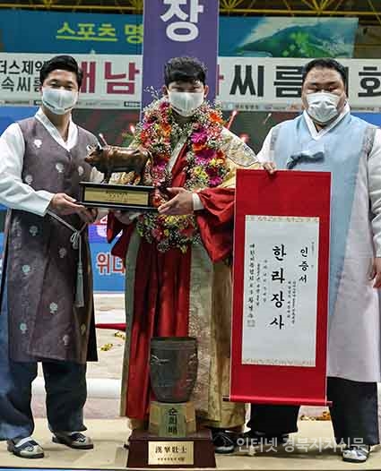 1ÇØ³²Àå»ç¾¾¸§´ëȸ¡¯ ÇѶóÀå»ç(105kgÀÌÇÏ)¿¡ µî±ØÇÑ ¿Àâ·Ï(¿µ¾Ï±º¹Î¼Ó¾¾¸§´Ü)ÀÌ Àå»çÀÎÁõ¼¿Í Ȳ¼ÒÆ®·ÎÇǸ¦ µé°í ±â³ä»çÁøÀ» Âï°í ÀÖ´Ù.