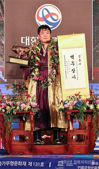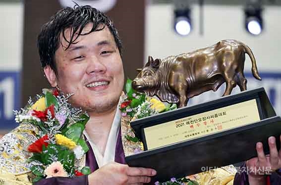 ¿¹Ãµ±º ¿¹Ãµ±º¹®ÈüÀ°¼¾ÅÍ¿¡¼ ¿¸° À§´õ½ºÁ¦¾à 2021 ¿¹Ãµ´Ü¿ÀÀå»ç¾¾¸§´ëȸ ¹éµÎÀå»ç(140kgÀÌÇÏ)¿¡ µî±ØÇÑ ±èÁø(ÁõÆò±ºÃ»)ÀÌ Àå»çÀÎÁõ¼¿Í Ȳ¼ÒÆ®·ÎÇǸ¦ µé°í ²É°¡¸¶¿¡ ¿Ã¶ó ±â³ä»çÁøÀ» Âï°í ÀÖ´Ù.