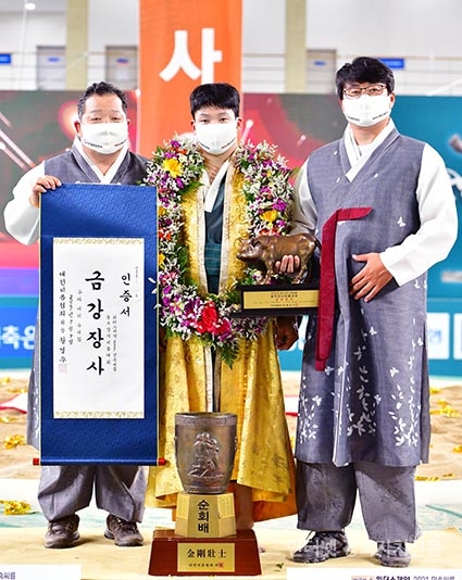 ¿ï»ê±¤¿ª½Ã ¿ïÁÖ±º ¿ïÁÖ±º¹ÎüÀ°°ü¿¡¼ ¿¸° ¡®À§´õ½ºÁ¦¾à 2021 ¹Î¼Ó¾¾¸§ ¿ïÁÖÀå»ç¾¾¸§´ëȸ¡¯ ±Ý°Àå»ç(90kgÀÌÇÏ)¿¡ µî±ØÇÑ ÃÖ¿µ¿ø(žȱºÃ»)ÀÌ °ûÇöµ¿ °¨µ¶(¿ÞÂÊ), ÀÌÇѽŠÄÚÄ¡(¿À¸¥ÂÊ)¿Í ÇÔ²² ±â³ä»çÁøÀ» Âï°í ÀÖ´Ù.