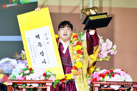 4¹®°æ´Ü¿ÀÀå»ç¾¾¸§´ëȸ¡¯ ¹éµÎÀå»ç(140kgÀÌÇÏ)¿¡ µî±ØÇÑ ÃÖ¼º¹Î(žȱºÃ»)ÀÌ ¿ì½Â ÈÄ ±â»ÝÀ» Ç¥Çϰí ÀÖ´Ù.