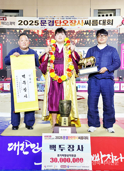 3¹®°æ½Ã ¹®°æ½Ç³»Ã¼À°°ü¿¡¼ ¿¸° ¡®À§´õ½ºÁ¦¾à 2025 ¹®°æ´Ü¿ÀÀå»ç¾¾¸§´ëȸ¡¯ ¹éµÎÀå»ç(140kgÀÌÇÏ)¿¡ µî±ØÇÑ ÃÖ¼º¹Î(žȱºÃ»)ÀÌ Àå»ç²É°¡¸¶¸¦ Ÿ°í Àå»çÀÎÁõ¼¿Í Ȳ¼ÒÆ®·ÎÇǸ¦ µé°í ±â³ä»çÁøÀ» Âï°í ÀÖ´Ù.