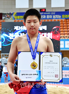 ÁõÆòÁ¾ÇÕ½ºÆ÷Ã÷¼¾ÅÍ¿¡¼ ¿¸° ¡®Á¦26ȸ ÁõÆòÀλï¹èÀü±¹Àå»ç¾¾¸§´ëȸ¡¯ÃʵîºÎ ¼ÒÀå±Þ(45kg ÀÌÇÏ)¿¡¼ 1À§¸¦ Â÷ÁöÇÑ ¹é¼º¹Î(¸ÅÈÃÊ)ÀÌ ±â³ä»çÁøÀ» Âï°í ÀÖ´Ù.