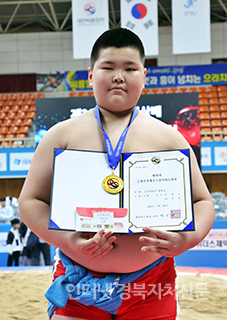 ÁõÆòÁ¾ÇÕ½ºÆ÷Ã÷¼¾ÅÍ¿¡¼ ¿¸° ¡®Á¦26ȸ ÁõÆòÀλï¹èÀü±¹Àå»ç¾¾¸§´ëȸ¡¯ÃʵîºÎ ¿ë»ç±Þ(60kg ÀÌÇÏ)¿¡¼ 1À§¸¦ Â÷ÁöÇÑ °í°¡¿Â(¿ì¸¸ÃÊ)ÀÌ ±â³ä»çÁøÀ» Âï°í ÀÖ´Ù.