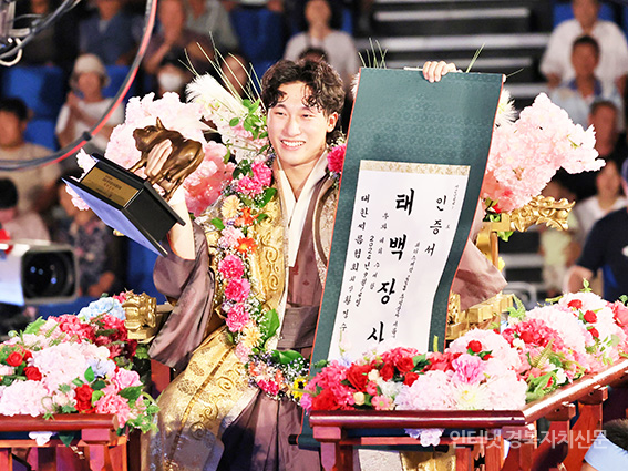 2024 Ãß¼®Àå»ç¾¾¸§´ëȸ¡¯ ŹéÀå»ç(80kgÀÌÇÏ)¿¡ µî±ØÇÑ ÃÖ¿øÁØ(â¿øÆ¯·Ê½Ãû)ÀÌ ²É°¡¸¶¿¡ ¿Ã¶óŸ Àå»çÀÎÁõ¼­¿Í Ȳ¼ÒÆ®·ÎÇǸ¦ µé°í ±â³ä»çÁøÀ» Âï°í ÀÖ´Ù.