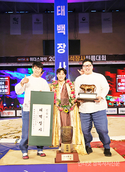 32024 Ãß¼®Àå»ç¾¾¸§´ëȸ¡¯ ŹéÀå»ç(80kgÀÌÇÏ)¿¡ µî±ØÇÑ ÃÖ¿øÁØ(â¿øÆ¯·Ê½Ãû)ÀÌ ¸ðÁ¦¿í °¨µ¶(¿ÞÂÊ)°ú ¹ÚÁ¤¼® ÄÚÄ¡(¿À¸¥ÂÊ)¿Í ±â³ä»çÁøÀ» Âï°í ÀÖ´Ù.