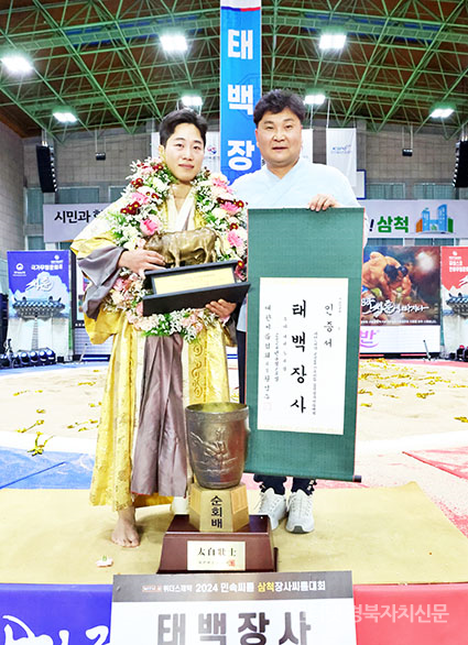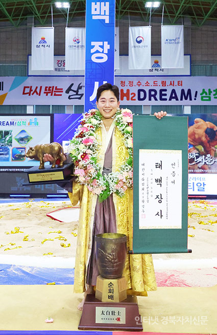 »ïôÀå»ç¾¾¸§´ëȸ¡¯ ŹéÀå»ç(80kgÀÌÇÏ)¿¡ µî±ØÇÑ Á¤¹Î±Ã(ÀÎõ±¤¿ª½Ãû)ÀÌ Àå»çÀÎÁõ¼¿Í Ȳ¼ÒÆ®·ÎÇǸ¦ µé°í ±â³ä»çÁøÀ» Âï°í ÀÖ´Ù.