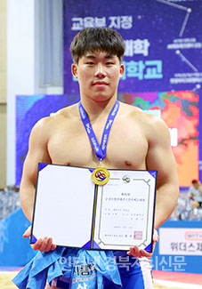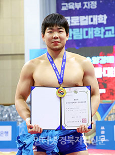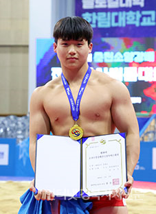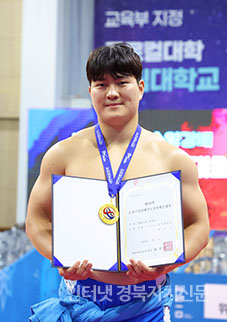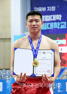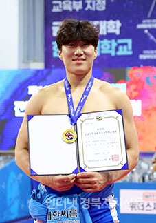 Ãáõ¼Ò¾ç°¹èÀü±¹Àå»ç¾¾¸§´ëȸ¡¯ ´ëÇб³ºÎ ¿ë»ç±Þ(95kg ÀÌÇÏ)¿¡¼ 1À§¸¦ Â÷ÁöÇÑ ÀÌűÔ(°æ±â´ë)°¡ ¸Þ´ÞÀ» ¸Þ°í »óÀåÀ» µé°í ±â³ä»çÁøÀ» Âï°í ÀÖ´Ù.