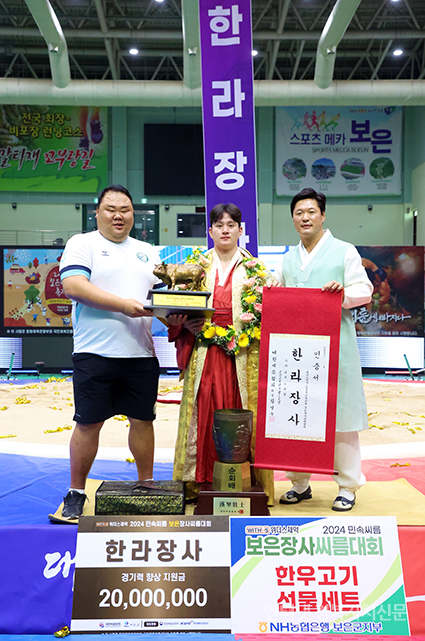 2024 ¹Î¼Ó¾¾¸§ º¸ÀºÀå»ç¾¾¸§´ëȸ¡¯ ÇѶóÀå»ç(105kgÀÌÇÏ)¿¡ µî±ØÇÑ Â÷¹Î¼ö(¿µ¾Ï±º¹Î¼Ó¾¾¸§´Ü)°¡ ±è±âÅ °¨µ¶°ú(¿À¸¥ÂÊ) À±Á¤¼ö ÄÚÄ¡(¿ÞÂÊ)¿Í ±â³ä»çÁøÀ» Âï°í ÀÖ´Ù.