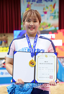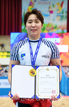 3ÀåÈﱺ ÀåÈï½Ç³»Ã¼À°°ü¿¡¼­ ¿­¸° ¡®Á¦61ȸ ´ëÅë·É±âÀü±¹Àå»ç¾¾¸§´ëȸ¡¯ ¿©ÀںΠ±¹È­±Þ(70kgÀÌÇÏ)¿¡¼­ 1À§¸¦ Â÷ÁöÇÑ ÀÓ¼öÁ¤(¿µµ¿±ºÃ»)°¡ ¸Þ´ÞÀ» ¸Þ°í »óÀåÀ» µé°í ±â³ä»çÁøÀ» Âï°í ÀÖ´Ù.