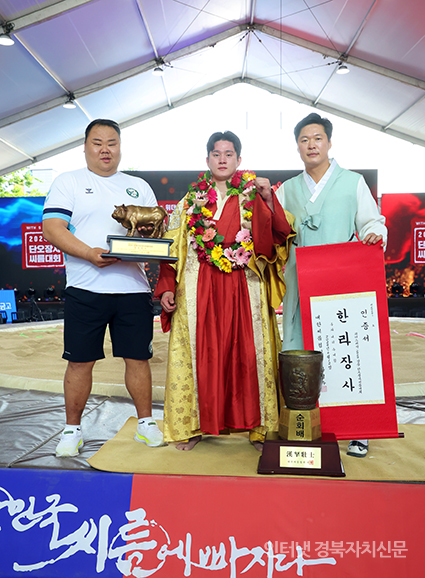 2°¸ª´Ü¿ÀÀå»ç¾¾¸§´ëȸ¡¯ ÇѶóÀå»ç(105kgÀÌÇÏ)¿¡ µî±ØÇÑ Â÷¹Î¼ö(¿µ¾Ï±º¹Î¼Ó¾¾¸§´Ü)°¡ ±è±âÅ °¨µ¶°ú(¿À¸¥ÂÊ) À±Á¤¼ö ÄÚÄ¡(¿ÞÂÊ)¿Í ±â³ä»çÁøÀ» Âï°í ÀÖ´Ù.