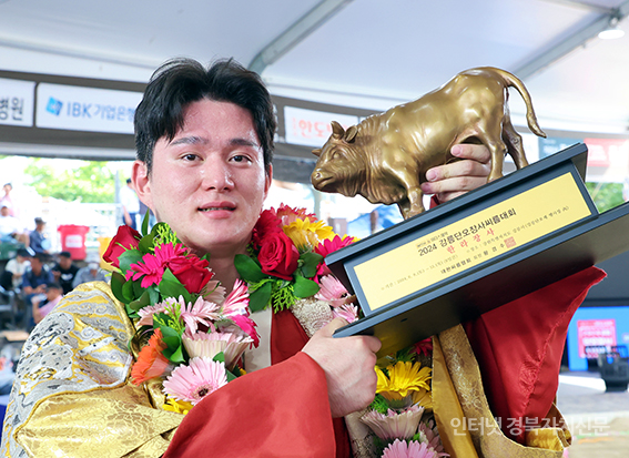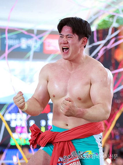 5°¸ª´Ü¿ÀÀå»ç¾¾¸§´ëȸ¡¯ ÇѶóÀå»ç(105kgÀÌÇÏ)¿¡ µî±ØÇÑ Â÷¹Î¼ö(¿µ¾Ï±º¹Î¼Ó¾¾¸§´Ü)°¡ ¿ì½Â ÈÄ ±â»ÝÀ» Ç¥Çϰí ÀÖ´Ù