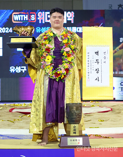 ¹Î¼Ó¾¾¸§ À¯¼º¿ÂõÀå»ç¾¾¸§´ëȸ¡¯ ¹éµÎÀå»ç(140kgÀÌÇÏ)¿¡ µî±ØÇÑ À强¿ì(MG»õ¸¶À»±Ý°í¾¾¸§´Ü)°¡ Ȳ¼ÒÆ®·ÎÇǸ¦ µé°í ±â³ä»çÁøÀ» Âï°í ÀÖ´Ù.