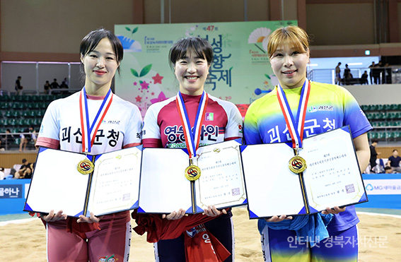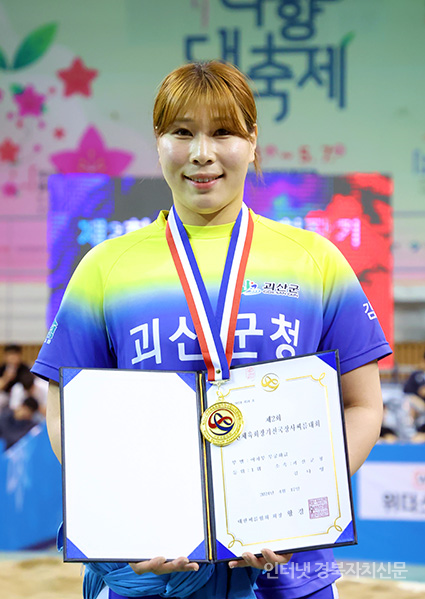 2¡®Á¦2ȸ ´ëÇÑüÀ°È¸Àå±âÀü±¹Àå»ç¾¾¸§´ëȸ¡¯ ¿©ÀںΠ¸ÅȱÞ(60kgÀÌÇÏ)¿¡¼ 1À§¸¦ Â÷ÁöÇÑ ÃÖ´ÙÇý(±«»ê±ºÃ»)°¡ ¸Þ´ÞÀ» ¸Þ°í »óÀåÀ» µé°í ±â³ä»çÁøÀ» Âï°í ÀÖ´Ù.